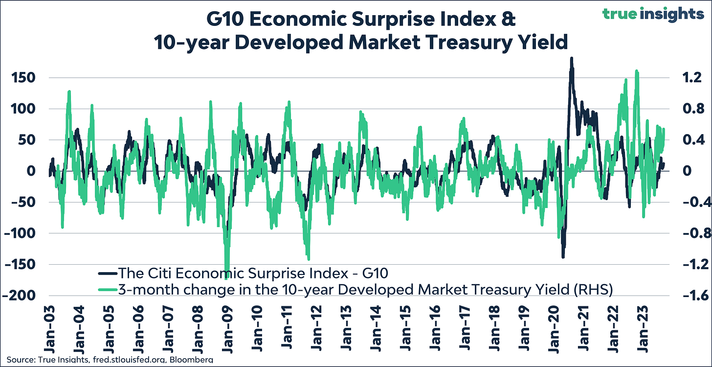 This cannot be said of the spiking bond yields, which are way ahead of economic surprises.