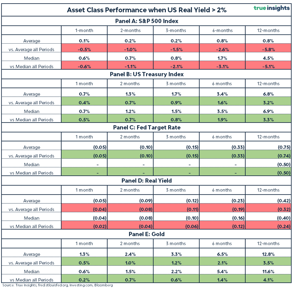 We calculate 1-month to 12-month future returns on stock, US Treasuries, and gold following days when the 10-year real yield closed above 2%. We calculate the change in basis points to determine the impact on the Fed Target Rate and the real yield. We assess absolute returns and changes. In addition, we compare them to returns and changes measured over ALL 1-to-12-month periods, regardless of whether the 10-year real yield was above 2 The results are presented in the table below.