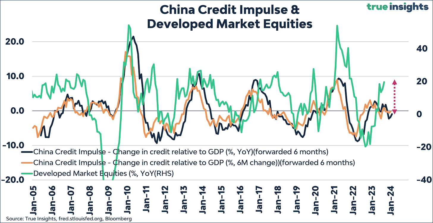 While the gap between stock performance and the Chinese Credit Impulse has narrowed, the signal remains negative. Even if stock prices remain at their current levels this month, the gap will not be closed.