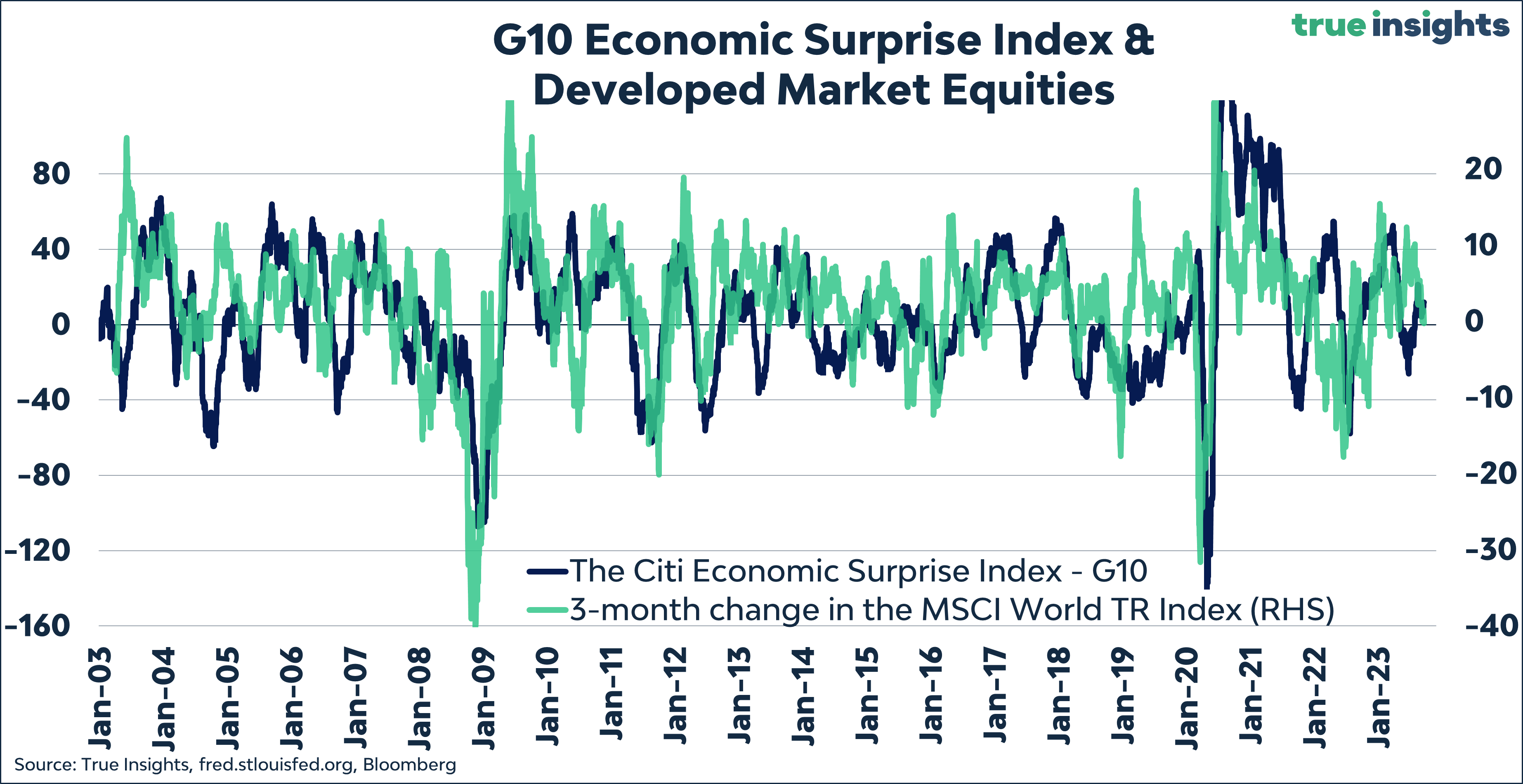 Global Macro Surprises are marginally positive, while equities are down in the last three months. Yet, the divergence between the two is relatively small.