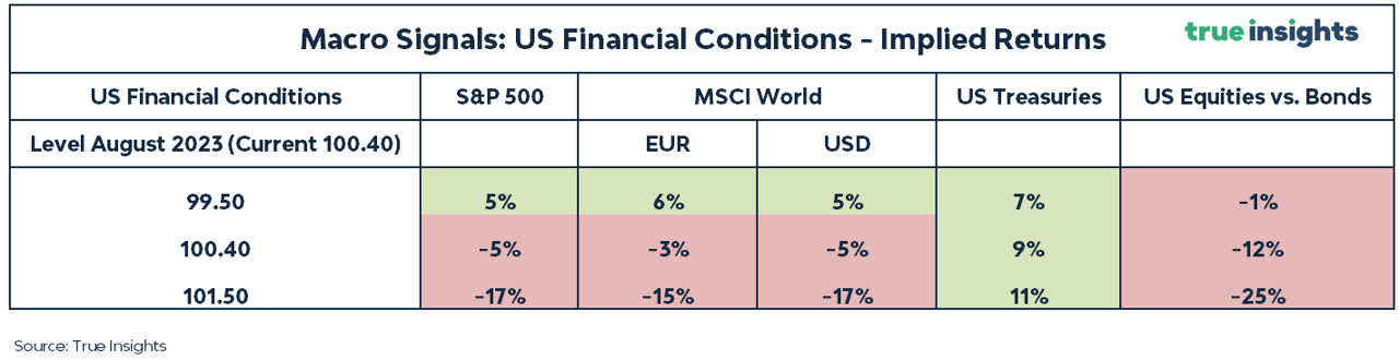 The table below shows the implied returns for different asset classes linked to three scenarios for financial conditions. A higher level of the Goldman Sachs US Financial Conditions Index means tighter conditions and vice versa.