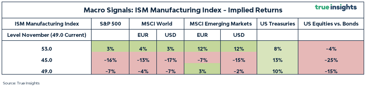 The table below presents the latest update of our ISM Manufacturing – Implied Returns analysis. As we argued last month, equity markets needed a miracle from the ISM Manufacturing Index to erase significant downside. This hasn’t happened, and equities have dropped across the board.