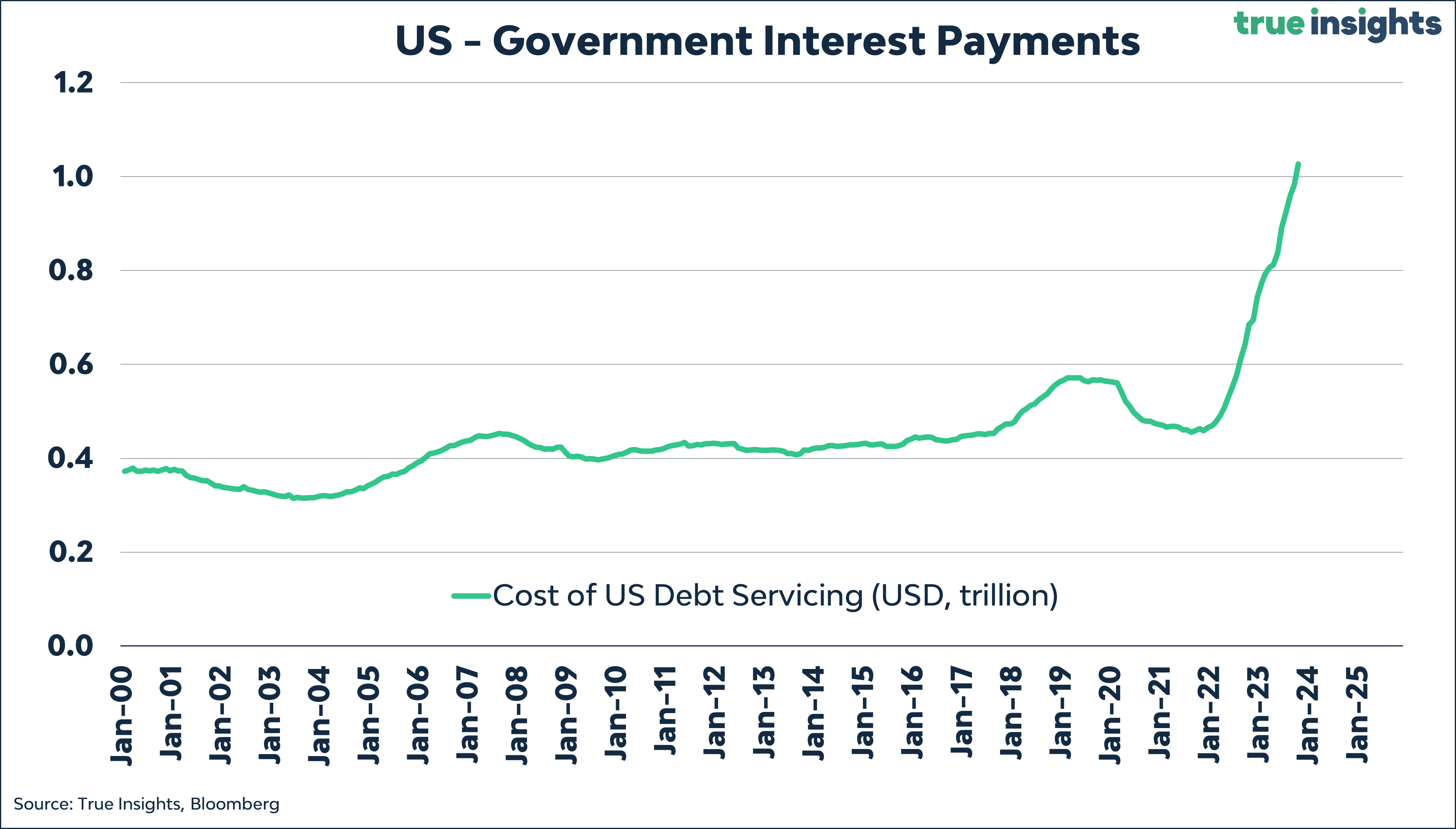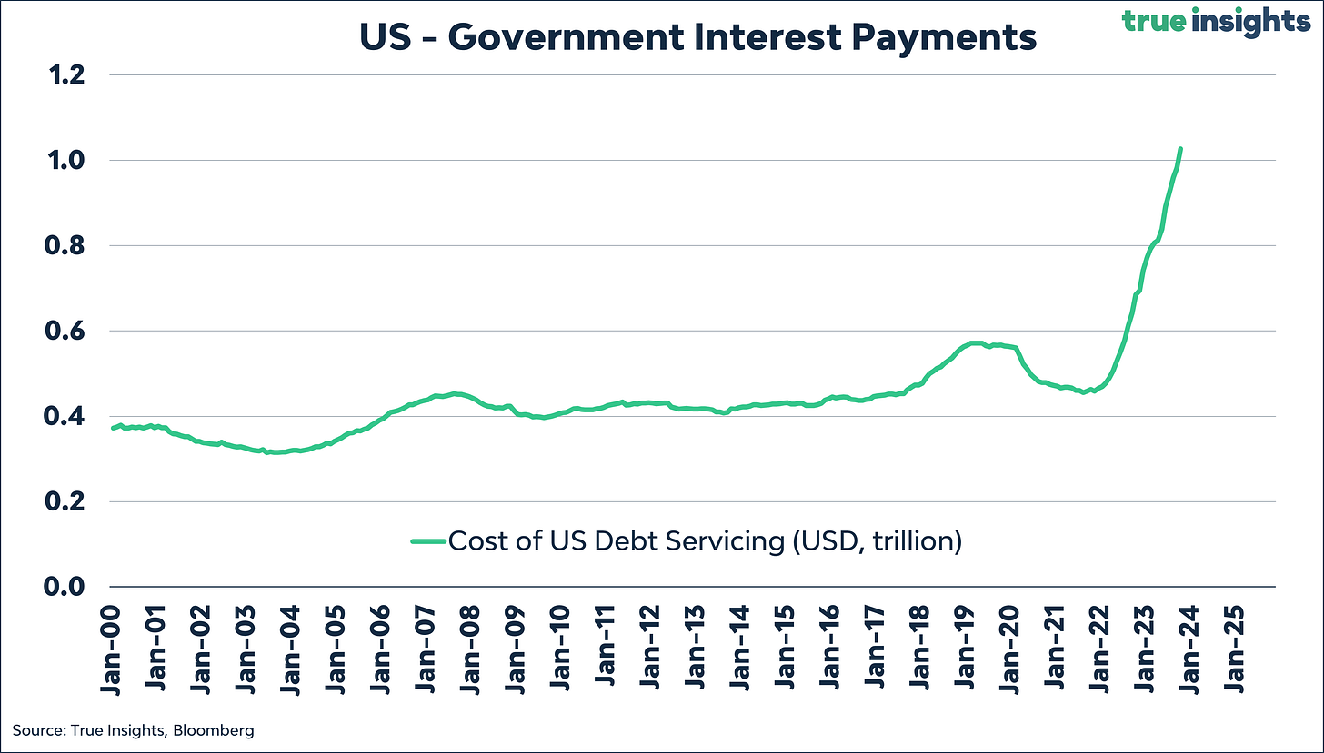 The US has crossed the dubious threshold of USD 1 trillion in (annualized) interest payments. Obviously, the numbers in the chart below should be adjusted for inflation, and a logarithmic scale would look neater, but the picture is clear. The US is on an unsustainable path regarding debt and interest expenses.