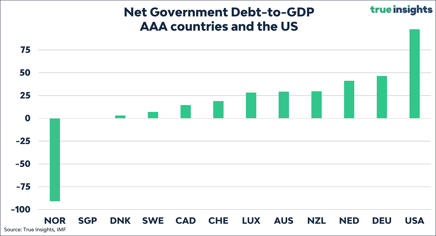 The US has a net debt burden twice as large as any country with a Triple-A rating. Norway is the only country with assets larger than its national debt. Much larger, to be precise. Primarily due to the Norwegian state pension fund, the Government Pension Fund Global, Norway’s net debt-to-GDP ratio is a whopping -90%.