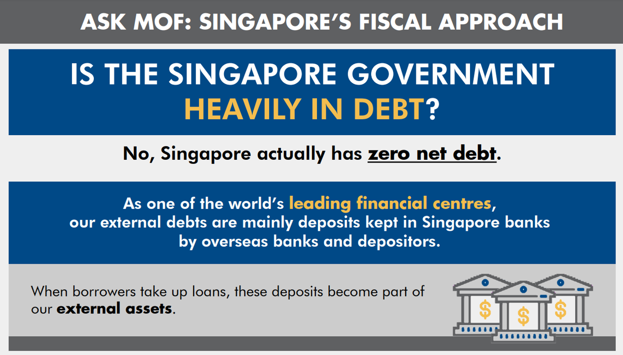 Singapore is an outlier. As one of Asia’s largest financial hubs, its ‘debt’ mainly consists of deposits kept in Singapore banks by overseas banks and depositors. Something the Ministry of Finance is very proud of, as evidenced by the poster on their website below.