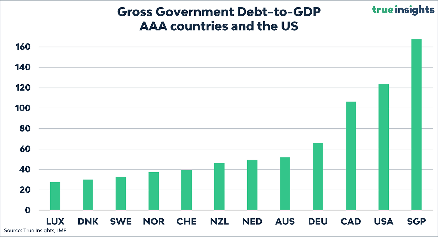 The US Government has no claim on the highest credit rating based on hard data whatsoever. The chart below shows the gross debt-to-GDP ratios of the small universe of countries with a Triple-A rating and the US. Only Singapore has a higher gross debt-to-GDP ratio, but I will come back to that in a second. Except for Canada (16% higher) and Germany (87% higher), the US has a debt-to-GDP ratio over twice as high as the other AAA-rated countries.