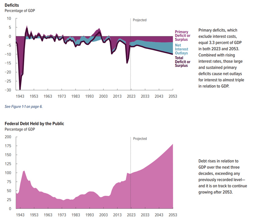Finally, the US’s primary deficits do not look great either. Below is the familiar chart from the Congressional Budget Office showing that the US is heading towards annual budget deficits of more than 10% of GDP annually. That certainly qualifies for a Triple-A confirmation.
