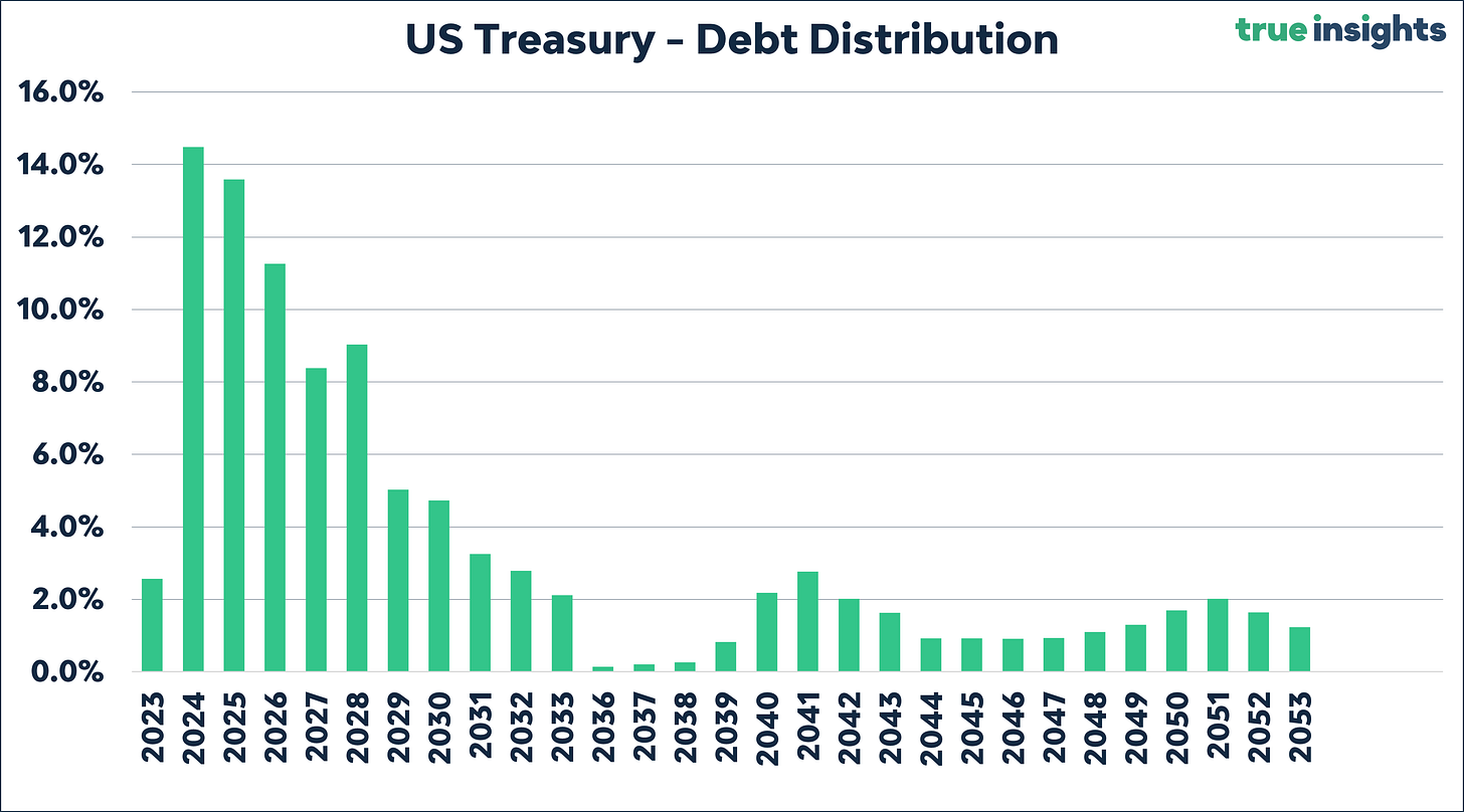 And things are getting worse. With the remainder of 2023 included, the US has to refinance 42% of its national debt over the next three years. That means that every month Powell manages to keep interest rates high, the interest bill will keep climbing. For comparison, Germany and the Netherlands have to refinance 17% and 23% of their national debt over the next three years, respectively.