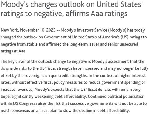 Moody’s changed the outlook on the US government debt to negative but affirmed the US AAA rating. Reading Moody’s rationale, it’s pretty absurd that an AAA rating is the outcome. But at the same time, not unexpected in a transition where the world’s largest and most powerful economy, carrying the deepest and most liquid bond market, gets dethroned. Given current developments, it would be naive not to consider the possibility that the United States may lose its unique, and perhaps untouchable, status in the global economy and financial markets.